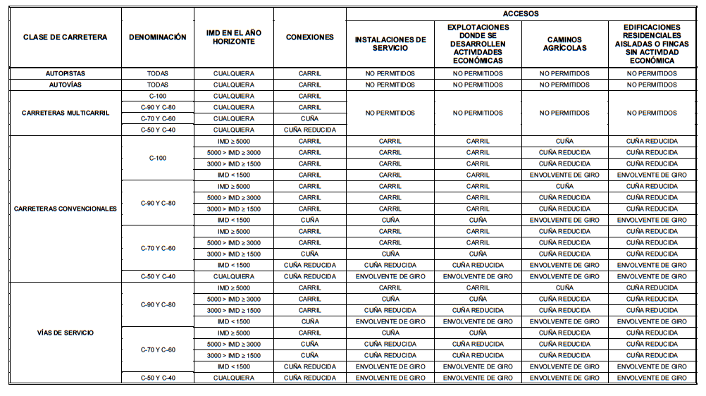 En carreteras convencionales no se proyectarán accesos en los que se permita el cruce de cualquier carril o de la propia calzada cuando el nivel de servicio se reduzca por la correspondiente actuación por debajo del especificado en la Tabla 7.1. Si esto se produjera se deberán realizar: