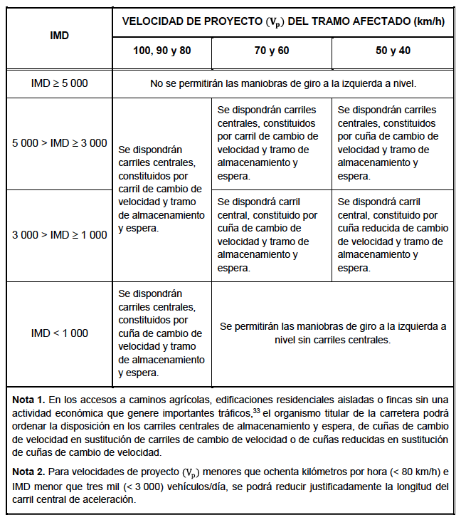 Los elementos para materializar los movimientos de entrada y salida en función de la velocidad de proyecto , de la IMD del tronco de la carretera en el año horizonte y de la categoría del acceso se indican en la Tabla 9.1.