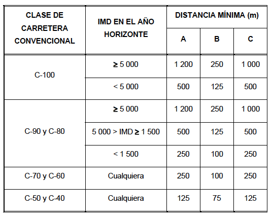 Las distancias mínimas entre un acceso a una carretera convencional y el acceso o conexión más próximo serán las distancias entre conexiones que se indican en la Tabla 9.3.