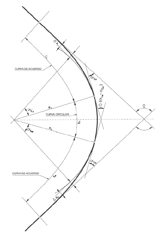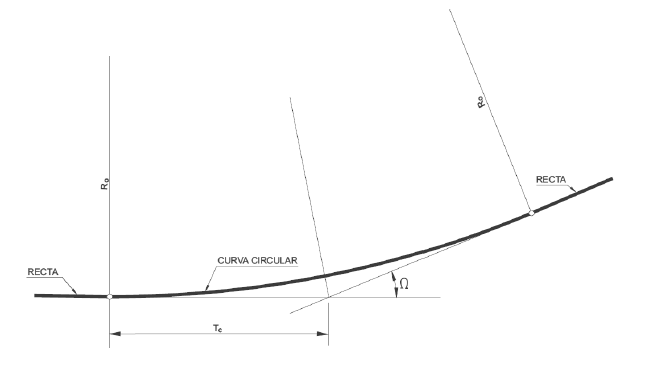FIGURA A4.1. ALINEACIÓN CURVA TIPO I CONSTITUIDA POR UNA CURVA CIRCULAR CENTRAL Y DOS CURVAS DE ACUERDO.