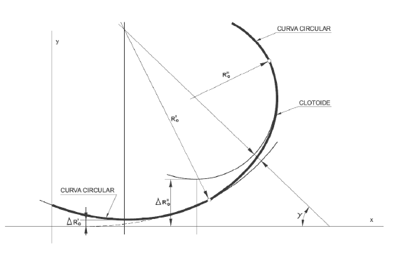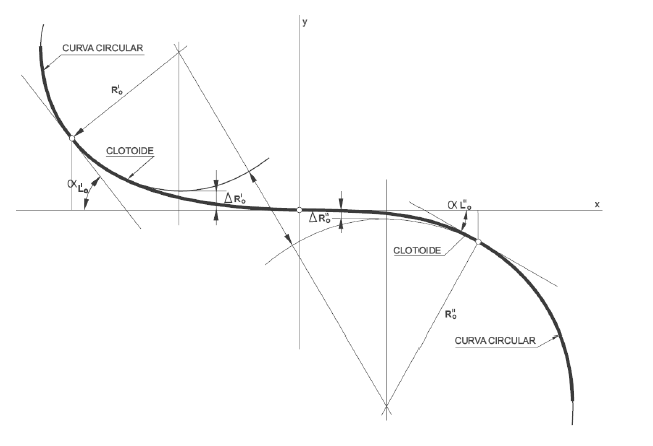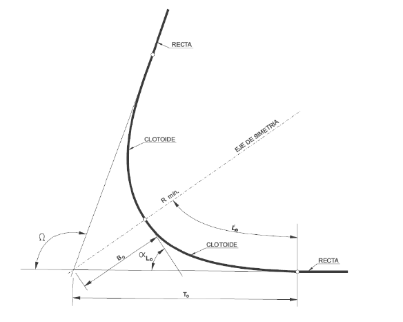 FIGURA A4.2. ALINEACIÓN CURVA TIPO II CONSTITUIDA POR DOS CURVAS DE ACUERDO TAMBIÉN DENOMINADA CLOTOIDES DE VÉRTICE O EN PUNTA.